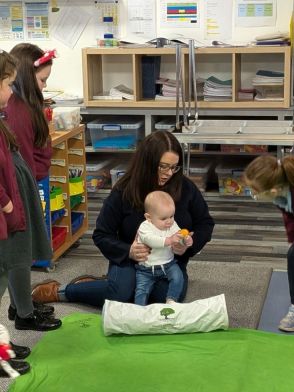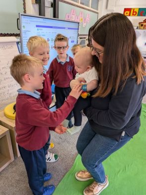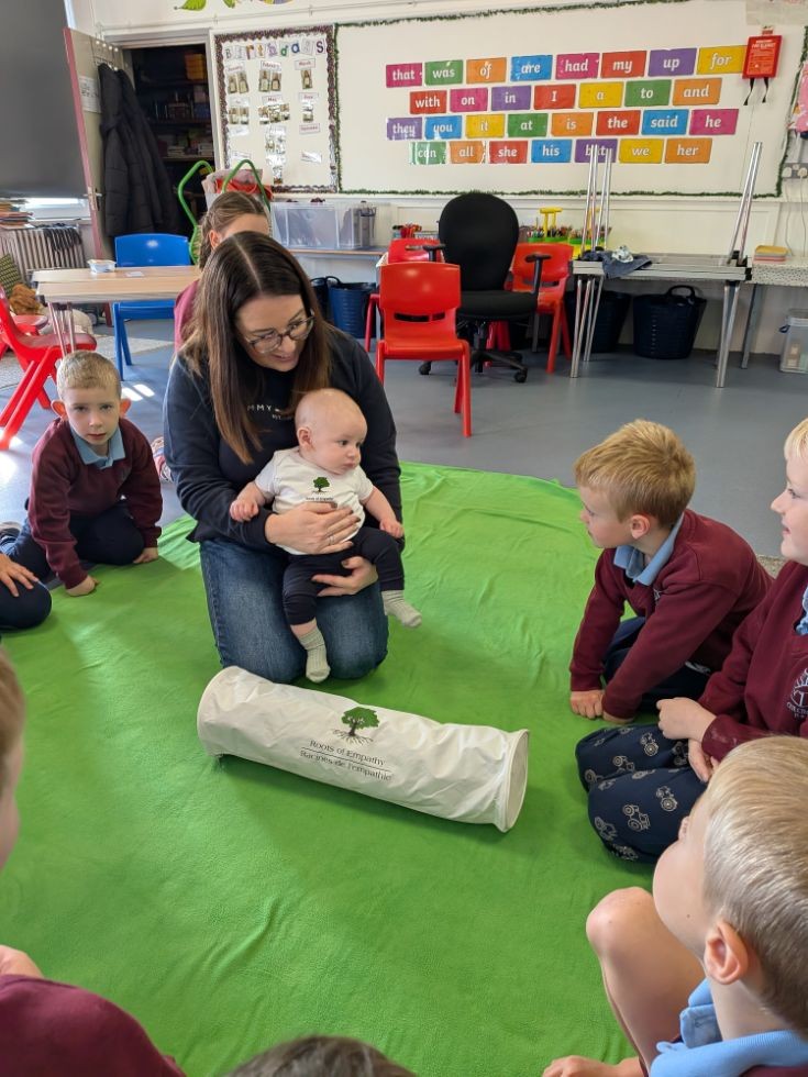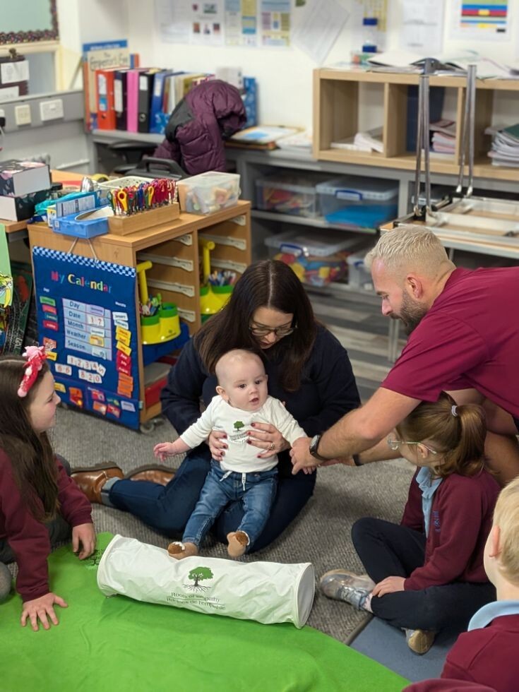 Mr Kearney is our Roots of Empathy Instructor who will introduce a class to a baby from our community who will act as a “Tiny Teacher”. The class will get to know the baby through nine monthly visits to their classroom. Over the course of the school year, we will watch the baby grow. The children predict and cheer when their Roots of Empathy baby reaches the ‘developmental milestones’ of the first year: “She can roll over!” “He got his first tooth!” “She can clap hands!” “He can sit up!” “She can wave!” “He can crawl!!”